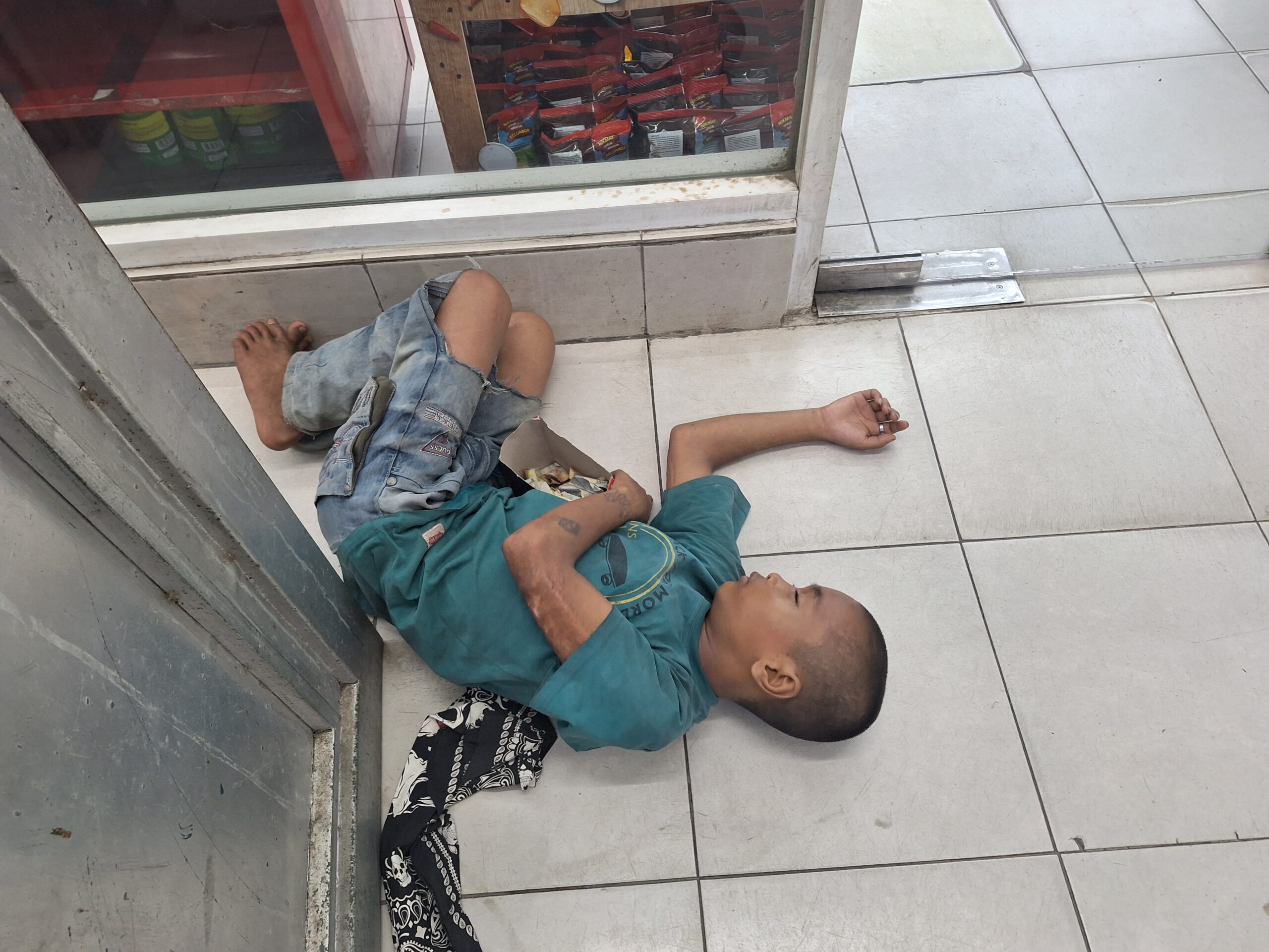 Ardi (08) nama samaran yang lagi tidur pulas tanpa beban sambil menyajikan sebuah kotak yang atasnya terbuka dengan merek “sudah matang tinggal makan” sepertinya paras tulus bocah tersebut mengeluarkan aura minta tolong pada setiap pengunjung yang mampir di Alfamart.
