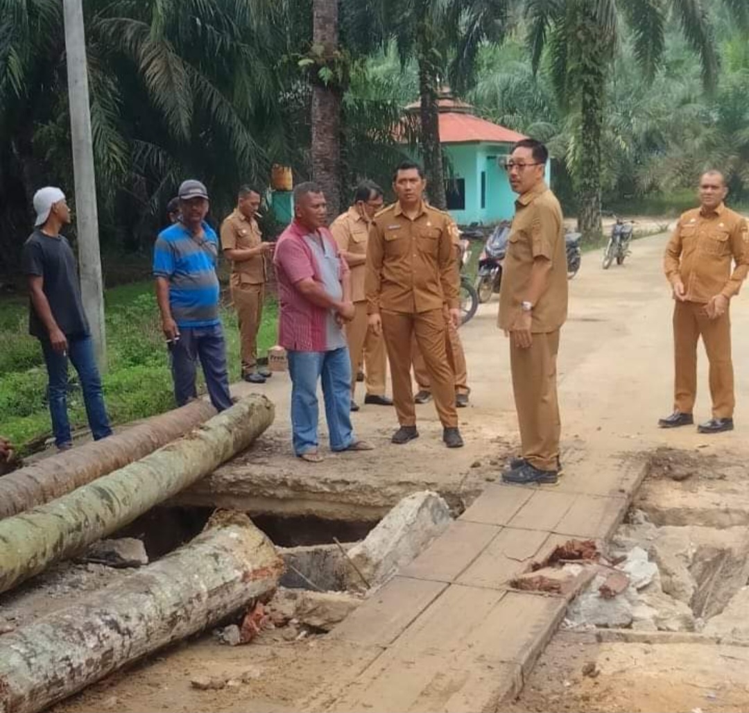 Bupati didamping Sekda Heri Wahyudi Marpaung, Kadis BPBD Ismail Sawito, Asisten III Fuadi dan Haji Sangkot anggota Dewan dari Fraksi PKB melihat dan langsung serta memecahkan persoalan ambrolnya box calvert tersebut.
