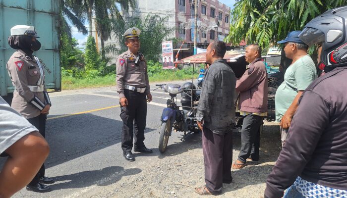 Kasat Lantas Iptu Sumardi melalui KBO Lantas Ipda AH Hasibuan dalam sosialisasinya kepada puluhan pengemudi Becak Bermotor (Betor) yang lagi menunggu sewa di depan SMAN1 Kotapinang.