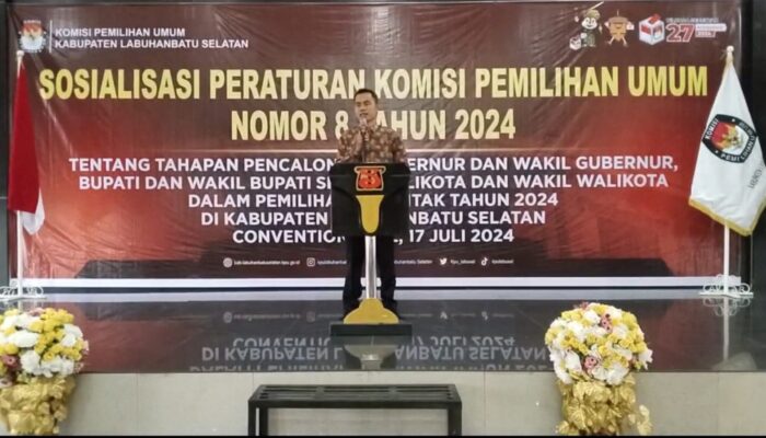 Labusel, goresnews.com Ketua KPU Saipul Bahri Dalimunthe membuka acara sosialisasi Peraturan Komisi Pemilihan Umum (PKPU) No. 08 Tahun 2024 di Convention Hall Hotel Grand Suma Blok Songo Rabu (17/07/2024)