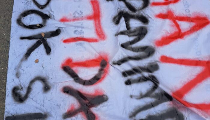 Baleho yang dipilok dengan warna hitam dan merah berisi tuntutan masa aksi (foto-can)