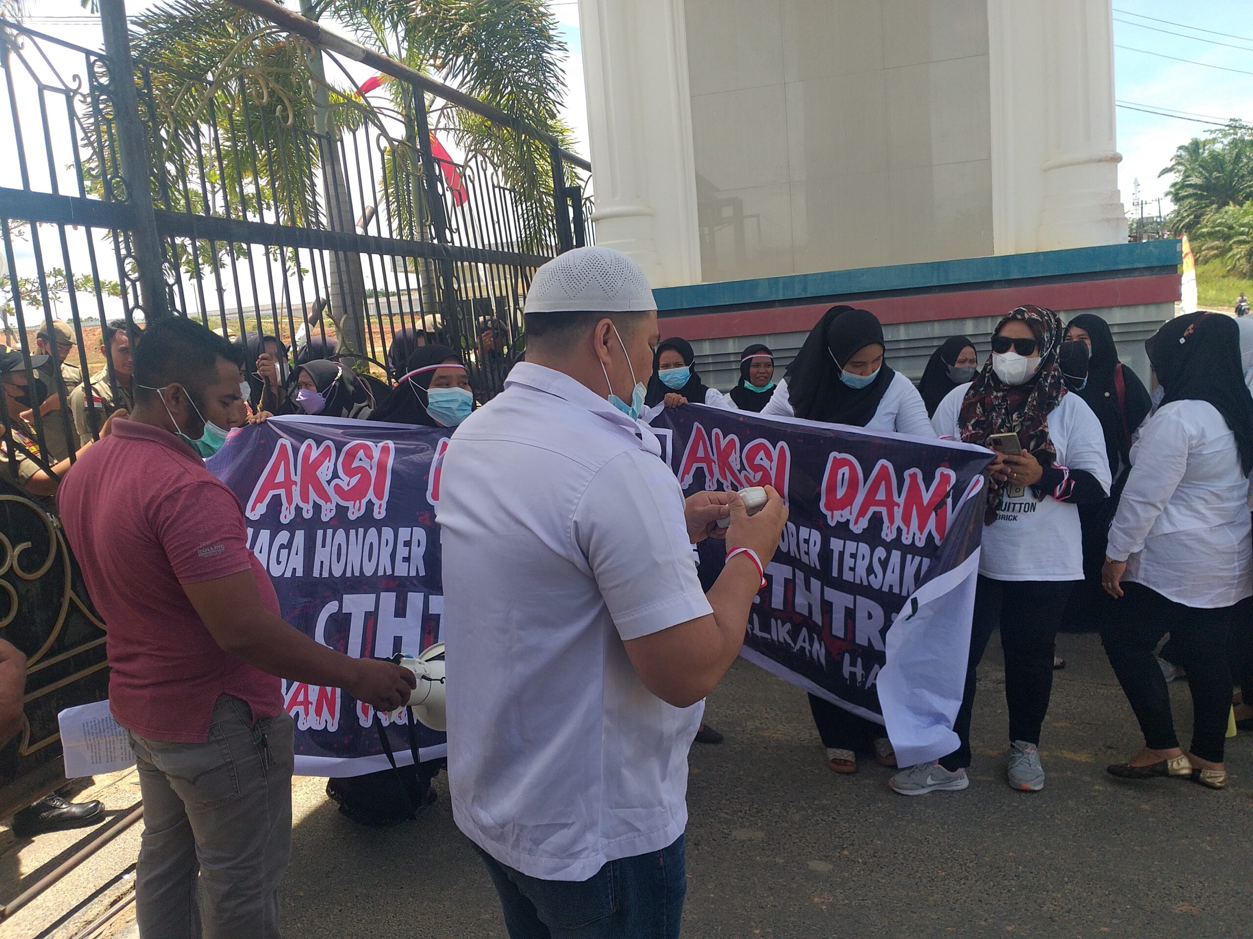 Orator Meriali Harahap (34) THTR sebelum dirumahkan bertugas DISHUB massa dinas 12 tahun, di depan gedung DPRD Jalinsum Desa Hadundung Kamis (25/08/2022) menyuarakan kekecewanya dengan tidak dipanggilnya kembali mereka bekerja di intansi tempat mereka berdinas.
