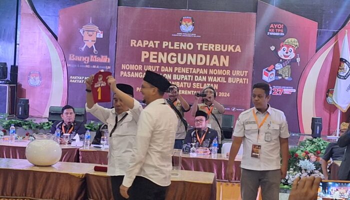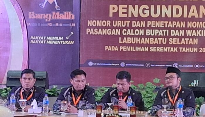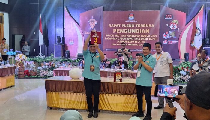 Kotapinang, goresnews.com Komisi Pemilihan Umum (KPU) Kabupaten Labuhanbatu Selatan laksanakan Rapat Pleno Terbuka (RPT) sekaligus pengundian dan penetapan nomor urut Pasangan Calon (Paslon) Bupati dan Wakil Bupati Labuhanbatu Selatan periode 2024 s/d 2029 Senin (23/09/2024) di Grand Suma Jalinsum Kotapinang – Rantauprapat, Desa Sisumut, Kecamatan Kotapinang, Kabupaten Labuhanbatu Selatan.